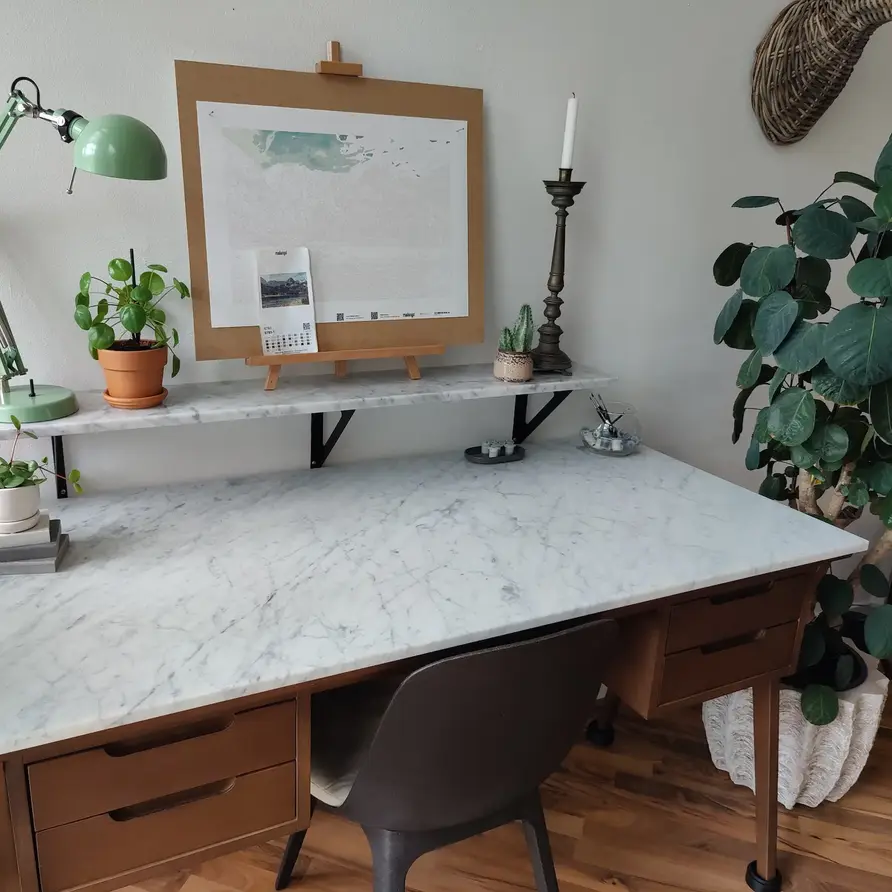 LET OP: Een marmeren blad van 3 cm dik is NIET geschikt als 'vrijhangend meubelblad', zoals veelvuldig wordt toepast bij een bureau, wandplank, tv-meubel, wastafelblad, etc. Houd er rekening mee dat de dragende kracht van marmer niet te vergelijken is met bijv. een blad van hout. Wij adviseren dan ook altijd om dit meubelblad te gebruiken als het OP een stevige en vlakke (bij voorkeur volledig bedekte) ondergrond komt te liggen.