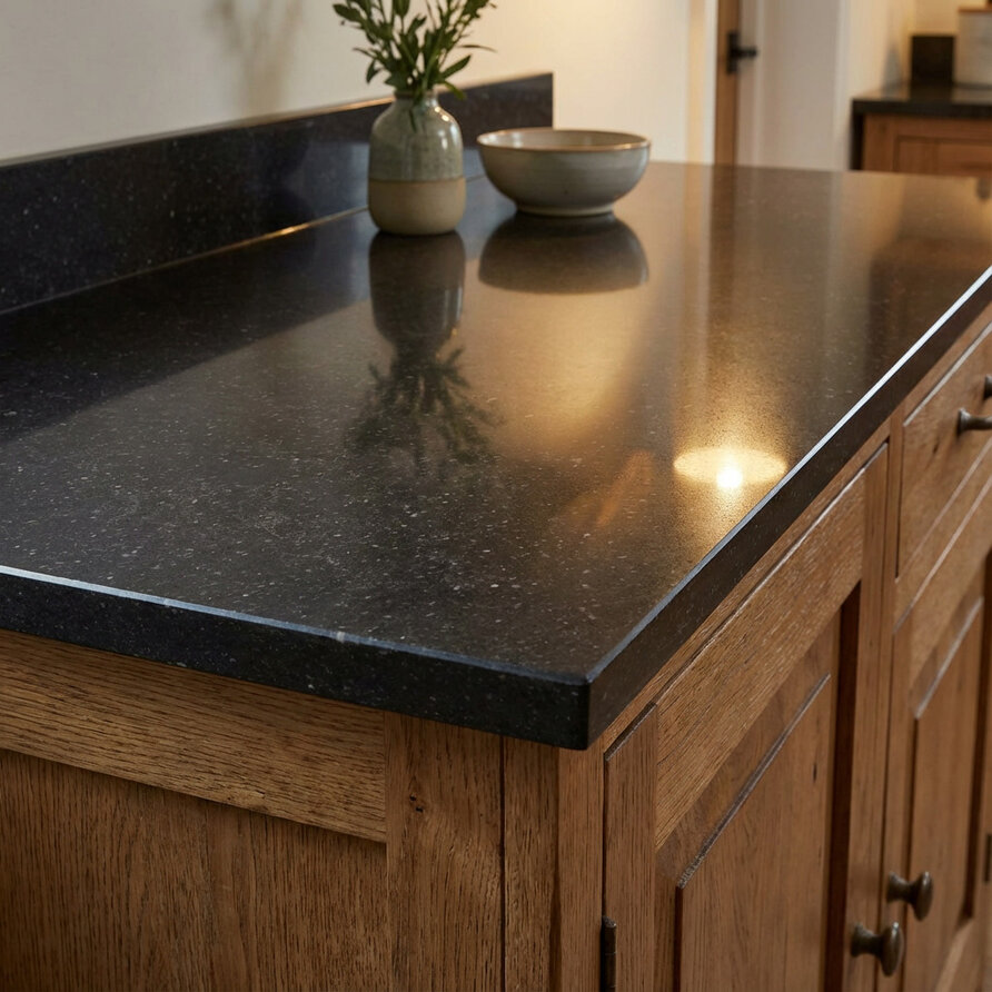 Een prachtig hardsteen look composiet werkblad voor binnen, met een sfeervolle look vervaardigd uit topkwaliteit gepolijst (glanzend) kwartscomposiet. Een bijzondere donkere antraciet kleurtint met subtiele tekeningen, gebaseerd op donkergezoet arduin. Lees meer
