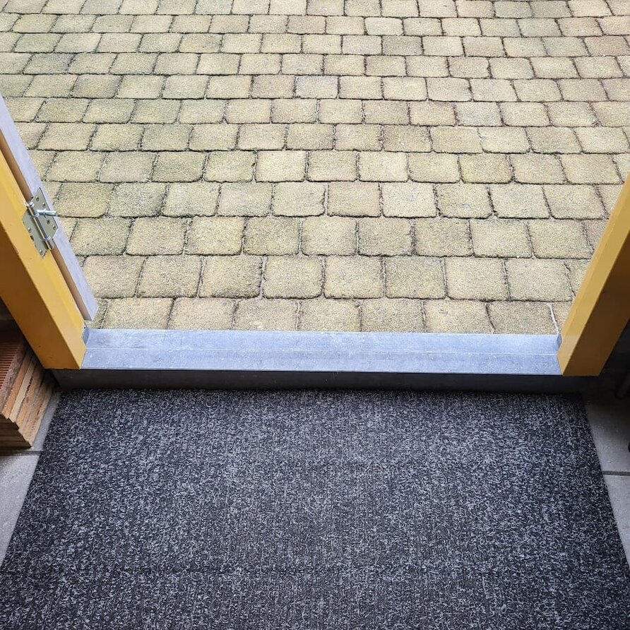 Een schuine (aflopende) hardstenen dorpel met opkant - 4 cm dik & geschuurd afgewerkt - voor buiten (buitendeur / voordeur), met een levendige blauwgrijze kleur (mat). Deze prachtige buitendorpel is vervaardigd uit de echte Belgische arduin uit Henegouwen Lees meer