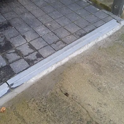 Buitendorpel schuin met opkant - Belgisch hardsteen - geschuurd (mat) - 4 cm dik - op maat - Aflopende deurdorpel / onderdorpel / waterkering (t.b.v. buitendeur / voordeur) van arduin (blauwsteen)