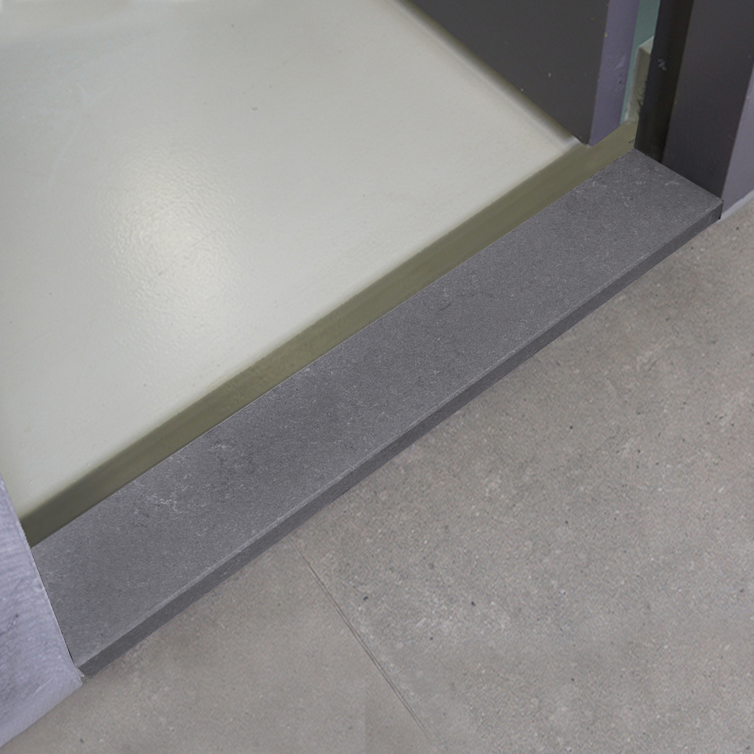 Dorpel binnendeur betonlook grijs - kwartscomposiet - gezoet (mat) - 2 cm dik - op maat - mat grijze beton imitatie quarts / quartz composiet stofdorpel / deurdorpel