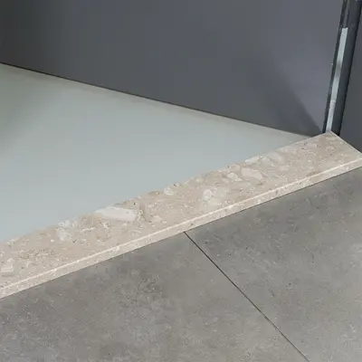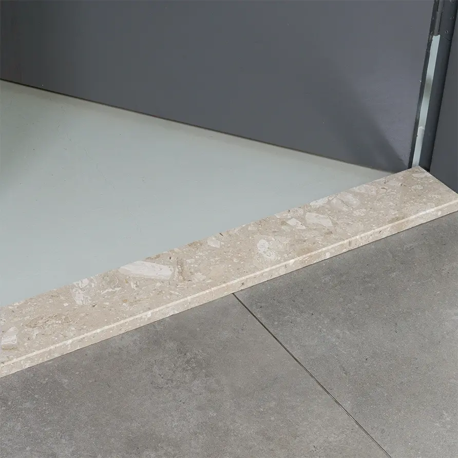 Een sfeervolle perlato marmerlook composiet binnendeur dorpel, met een warme uitstraling vervaardigd uit hoogwaardig gepolijst (glanzend) marmercomposiet. Een mooie beige/zand kleurtint met grove witte, grijze en bruinachtige tekeningen & accenten. Lees meer