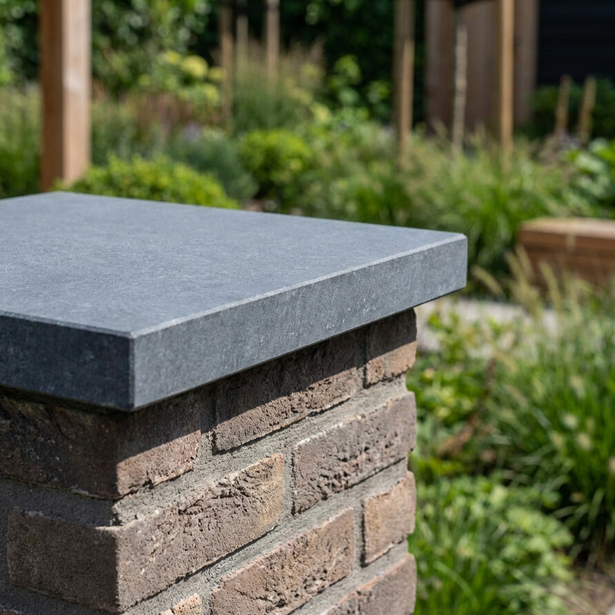 Een vlakke hardsteen paalmuts - 3 cm dik & geschuurd afgewerkt - voor buiten met een levendige blauwgrijze kleur (mat), vervaardigd uit de echte Belgische arduin uit Henegouwen. Een bijzondere paalkap voor een sfeervolle paalafdekking! Lees meer