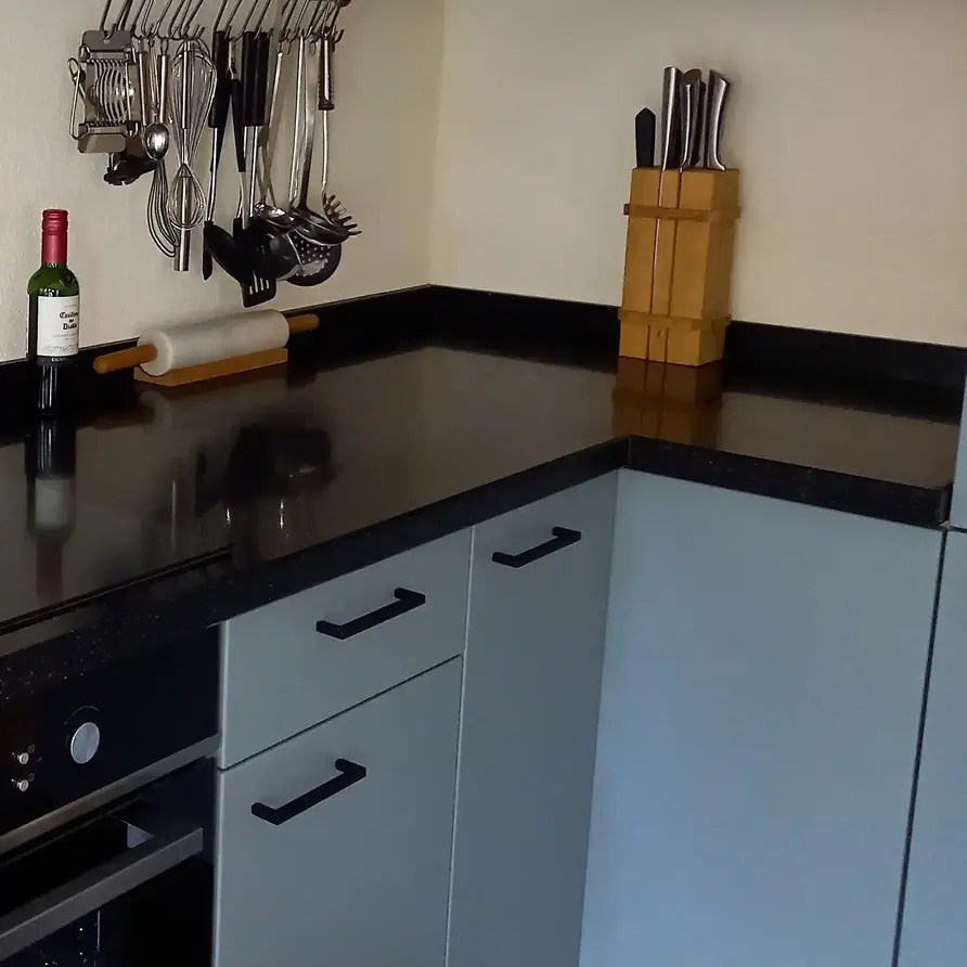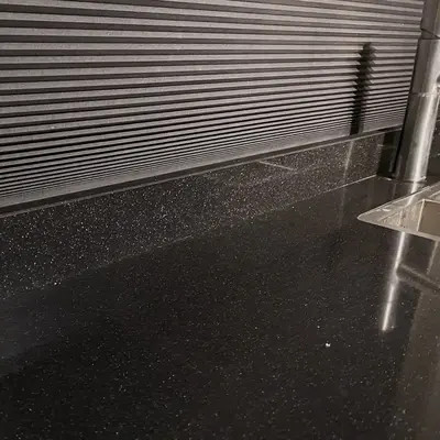 Een prachtige zwarte composiet plint voor binnen 2 cm dik, met een stijlvolle look vervaardigd uit hoogwaardig gepolijst (glanzend) kwartscomposiet. Een mooie zwarte kleurtint met een subtiele lichtgekleurde spikkels (natuursteen look). Lees meer
