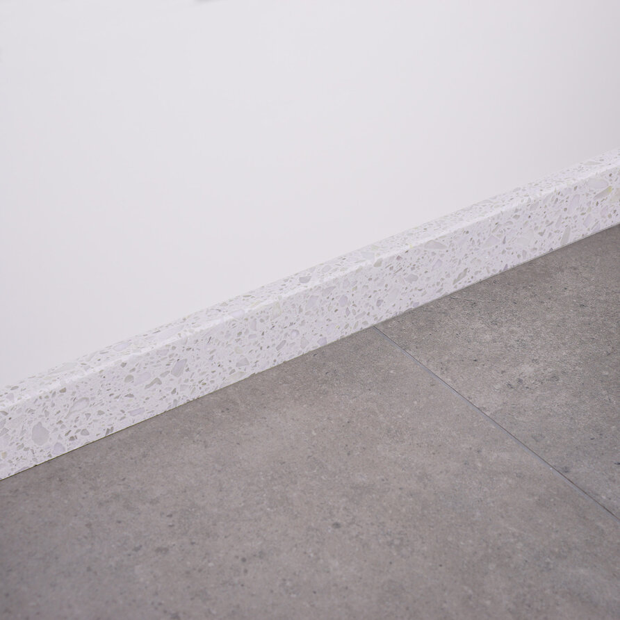 Een prachtige witte composiet plint voor binnen, met een sfeervolle terrazzo look vervaardigd uit hoogwaardig gepolijst (glanzend) marmercomposiet. Een mooie witachtige kleurtint wat grovere (licht)grijze korrelige accenten. Lees meer