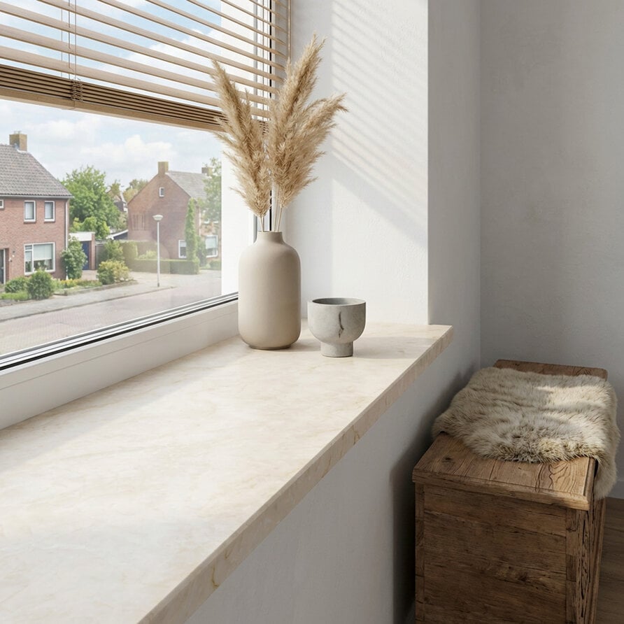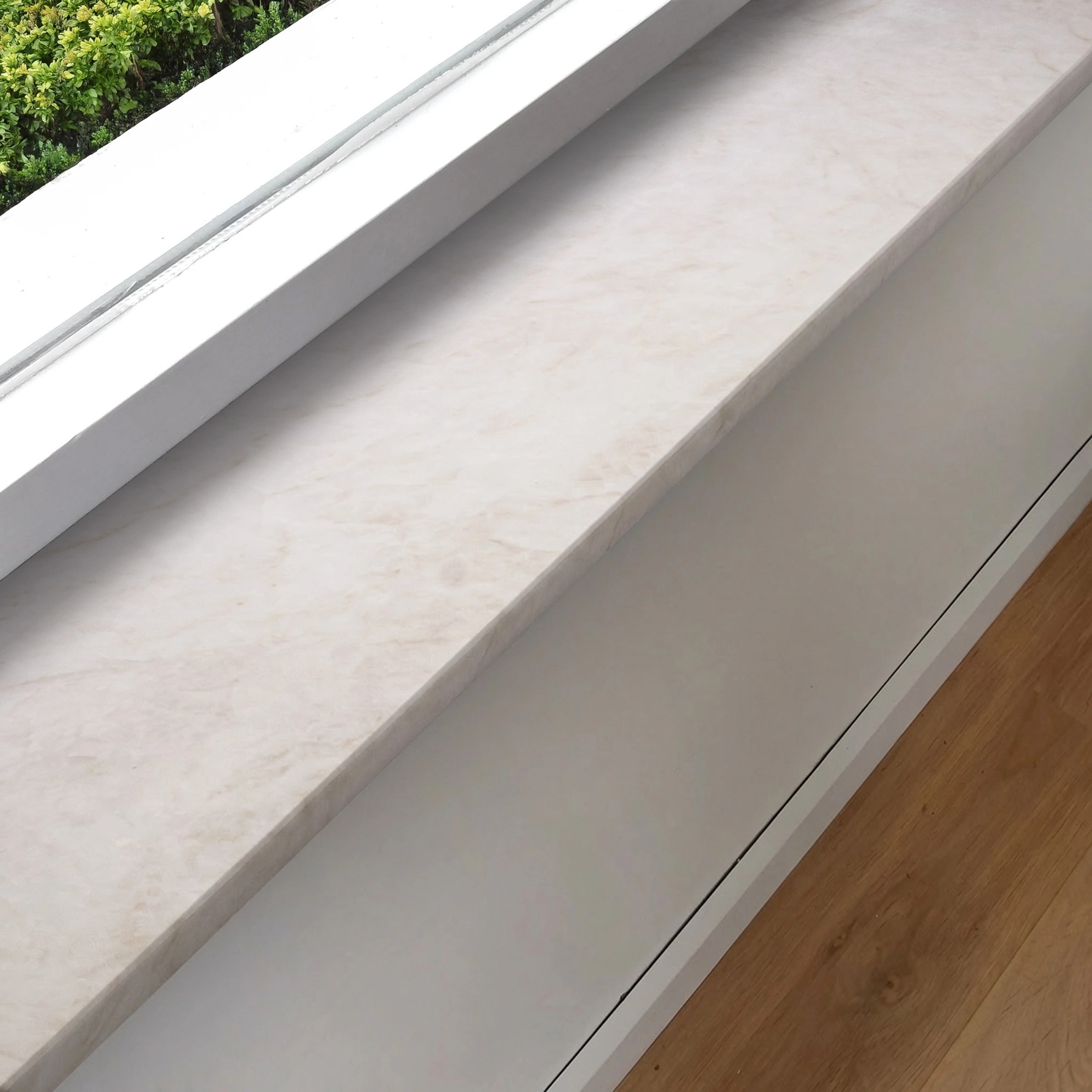 Sample (materiaal proefstuk / monster) - taj mahal look - kwartscomposiet (quarts / quartz) - gezoet (mat) - circa 7x5x2 cm. Twijfelt u bij een vensterbank kopen nog tussen materialen, over de specifieke kleurtint en/of een specifieke afwerking? In dat geval biedt onze sample service uitkomst! Bestel hier eenvoudig een sample van onze taj mahal look kwarts composiet (gezoet). Zo kunt u het materiaal - voordat u daadwerkelijk bestelt - rustig op uw gemak bekijken. De samples zijn daarnaast ideaal om de 'match' met uw interieur bepalen en om 2 (of meerdere) varianten met elkaar te vergelijken.