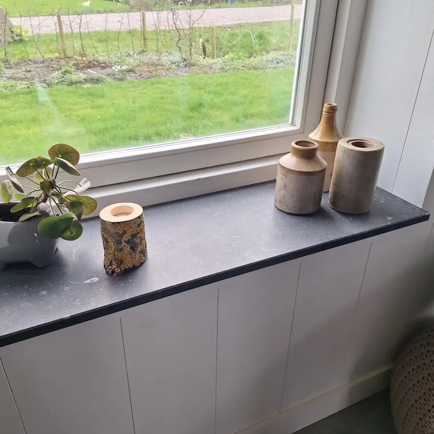 Een prachtige hardstenen vensterbank voor binnen - 2 cm dik & gezoet afgewerkt - met een levendige & sfeervolle blauwgrijze kleur (mat), vervaardigd uit de echte Belgische arduin uit Henegouwen! Lees meer