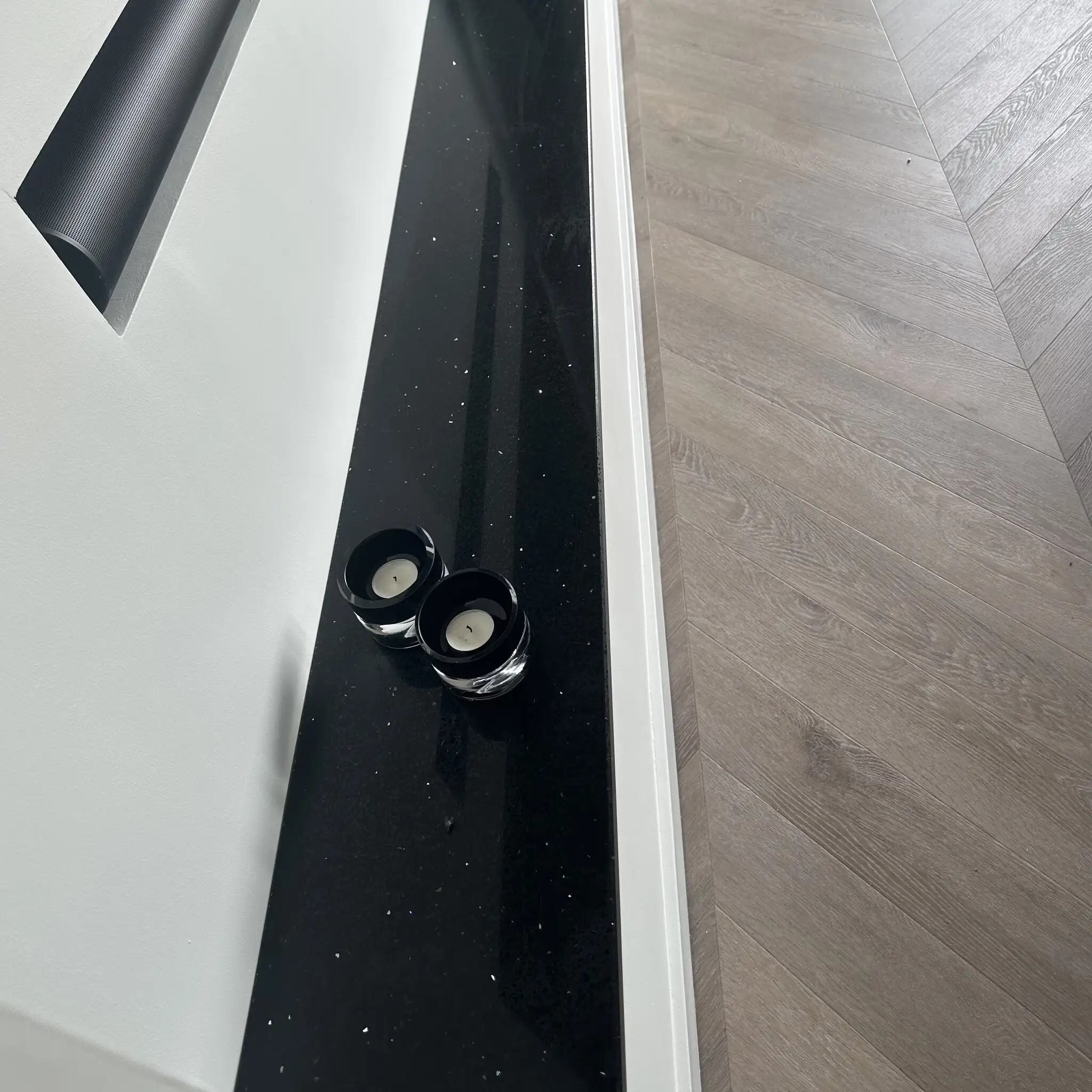 Een prachtige zwarte composiet vensterbank voor binnen, met een stijlvolle look vervaardigd uit hoogwaardig gepolijst (glanzend) kwartscomposiet. Een mooie zwarte kleurtint met vlokkenstructuur en sporadische glitterflakes. Lees meer