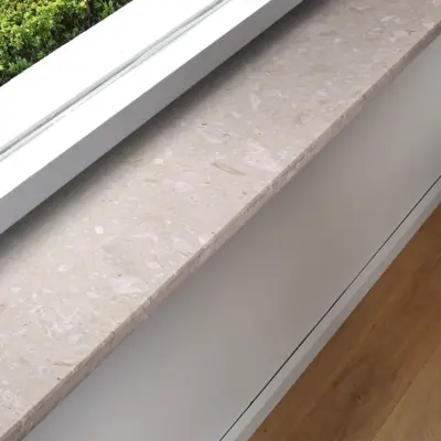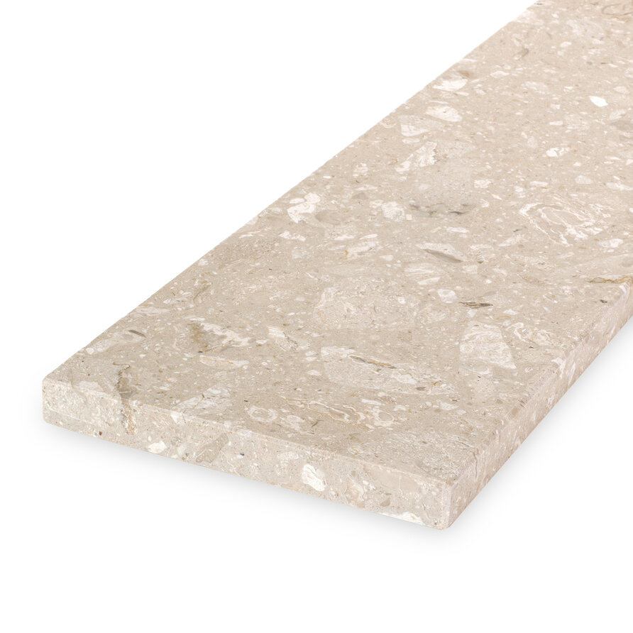 Een sfeervolle perlato marmerlook composiet vensterbank voor binnen, met een warme uitstraling vervaardigd uit hoogwaardig gepolijst (glanzend) marmercomposiet. Een mooie beige/zand kleurtint met grove witte, grijze en bruinachtige tekeningen & accenten. Lees meer