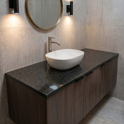 Dit wastafelblad is ideaal geschikt voor een opzet wasbak / waskom (of 2!) en wordt in eigen (natuursteen)zagerij voor u op maat gezaagd en afgewerkt, door ervaren vakmannen, met zorg & liefde voor het vak. Dit specifieke wastafelblad wordt normaal gesproken gebruikt als 'bovenblad', waarbij het als meubelblad op het wasmeubel / badmeubel komt te liggen. Standaard wordt uw wastafelblad recht gezaagd en worden de voorkant + beide zijkanten netjes afgewerkt, dat wilt zeggen gepolijst + afgewerkt met een facetrandje. Dit mooie (donkere) antraciet wastafelblad combineert stijl en luxe met een traditioneel accent. Een prachtig wastafelblad geschikt voor een breed scala aan interieurstijlen.