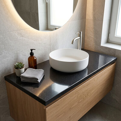Dit wastafelblad is ideaal geschikt voor een opzet wasbak / waskom (of 2!) en wordt in eigen (natuursteen)zagerij voor u op maat gezaagd en afgewerkt, door ervaren vakmannen, met zorg & liefde voor het vak. Dit specifieke wastafelblad wordt normaal gesproken gebruikt als 'bovenblad', waarbij het als meubelblad op het wasmeubel / badmeubel komt te liggen. Standaard wordt uw wastafelblad recht gezaagd en worden de voorkant + beide zijkanten netjes afgewerkt, dat wilt zeggen gepolijst + afgewerkt met een facetrandje. Dit mooie topkwaliteit composiet wastafelblad combineert een toegankelijke donkere kleurtint met subtiele accenten en past in praktisch iedere interieurstijl; van klassiek tot modern.