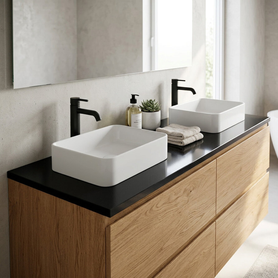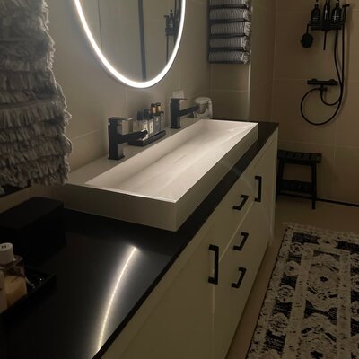 Dit wastafelblad is ideaal geschikt voor een opzet wasbak / waskom (of 2!) en wordt in eigen (natuursteen)zagerij voor u op maat gezaagd en afgewerkt, door ervaren vakmannen, met zorg & liefde voor het vak. Dit specifieke wastafelblad wordt normaal gesproken gebruikt als 'bovenblad', waarbij het als meubelblad op het wasmeubel / badmeubel komt te liggen. Standaard wordt uw wastafelblad recht gezaagd en worden de voorkant + beide zijkanten netjes afgewerkt, dat wilt zeggen gepolijst + afgewerkt met een facetrandje. Dit mooie topkwaliteit composiet wastafelblad is zeer toegankelijk en ideaal geschikt voor een breed scala aan interieurstijlen.