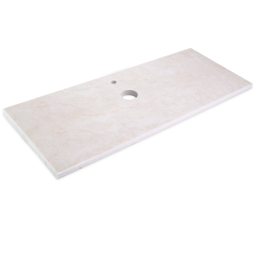 Dit wastafel blad is ideaal geschikt voor een opzet wasbak / waskom (of 2!) en wordt in eigen (natuursteen)zagerij voor u op maat gezaagd en afgewerkt, door ervaren vakmannen, met zorg & liefde voor het vak. Dit specifieke wastafelblad wordt normaal gesproken gebruikt als 'bovenblad', waarbij het als meubelblad op het wasmeubel / badmeubel komt te liggen. Standaard wordt uw wastafelblad recht gezaagd en worden de voorkant + beide zijkanten netjes afgewerkt, dat wilt zeggen gezoet + afgewerkt met een facetrandje. Deze mooie topkwaliteit composiet wastafelblad is - met haar warme, lichte kleur en elegante taj mahal kwartiet look - ideaal geschikt voor een sfeervol accent binnen uw interieur.