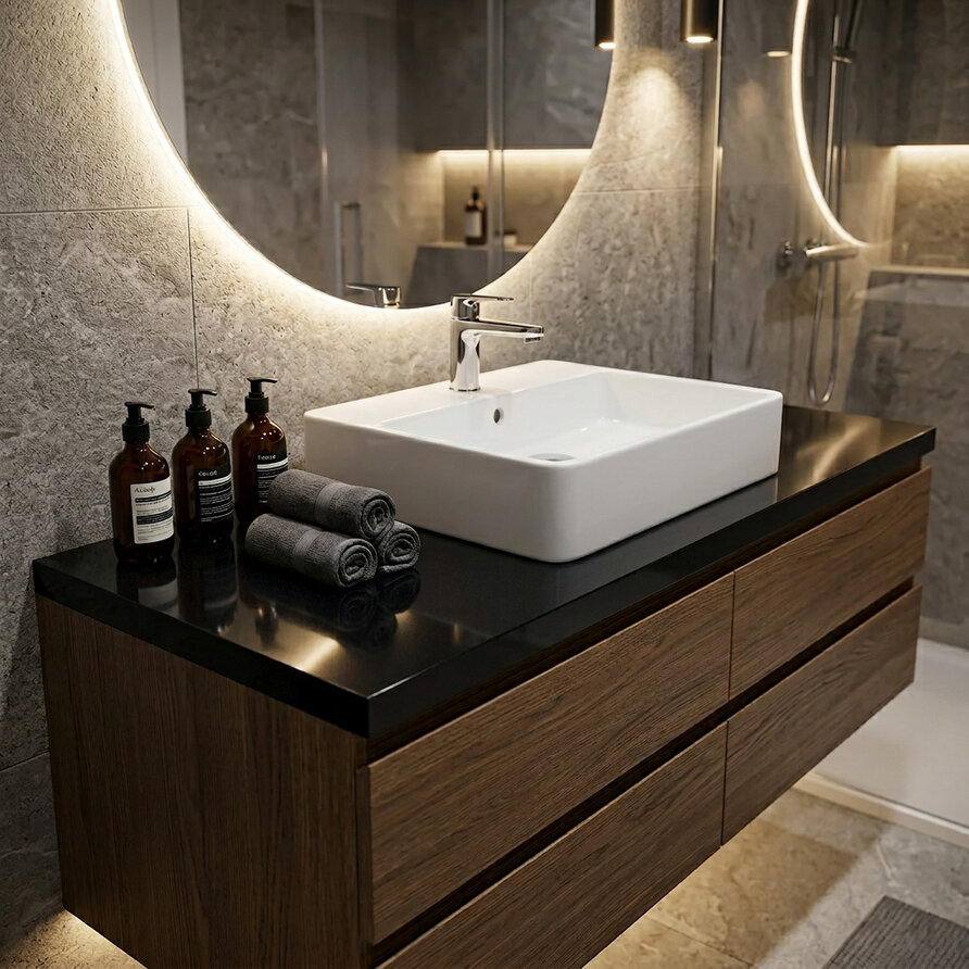 Dit wastafelblad is ideaal geschikt voor een opzet wasbak / waskom (of 2!) en wordt in eigen (natuursteen)zagerij voor u op maat gezaagd en afgewerkt, door ervaren vakmannen, met zorg & liefde voor het vak. Dit specifieke wastafelblad wordt normaal gesproken gebruikt als 'bovenblad', waarbij het als meubelblad op het wasmeubel / badmeubel komt te liggen. Standaard wordt uw wastafelblad recht gezaagd en worden de voorkant + beide zijkanten netjes afgewerkt, dat wilt zeggen gepolijst + afgewerkt met een facetrandje. Dit mooie topkwaliteit composiet wastafelblad is zeer toegankelijk en ideaal geschikt voor een breed scala aan interieurstijlen.