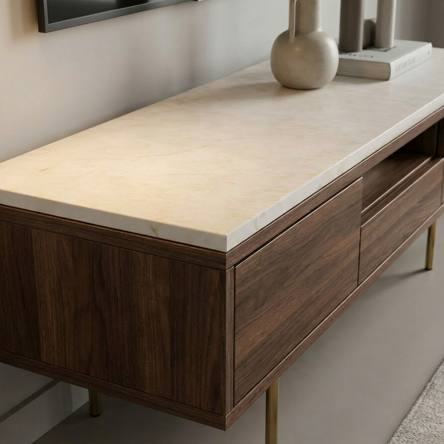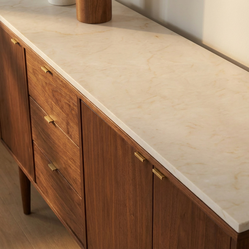 Een stijlvolle taj mahal look composiet werkblad voor binnen, met een warme uitstraling, vervaardigd uit hoogwaardig gezoet (mat) kwartscomposiet. Een bijzondere crème/beige kleurtint met subtiele witte en bruinachtige tekeningen & accenten. Lees meer